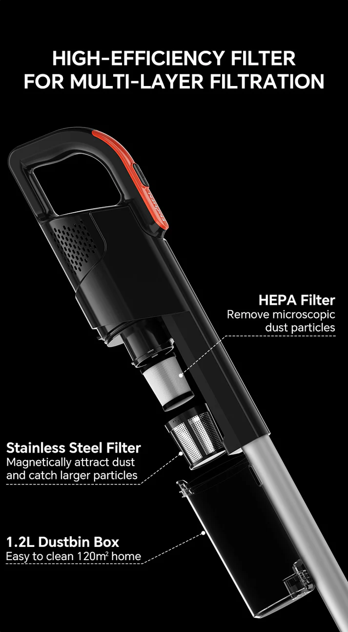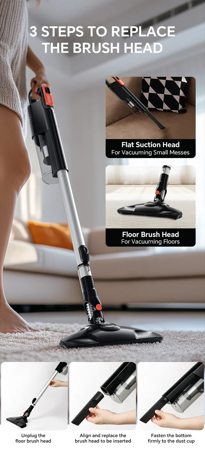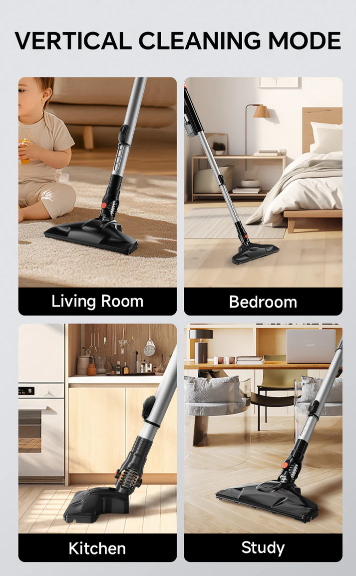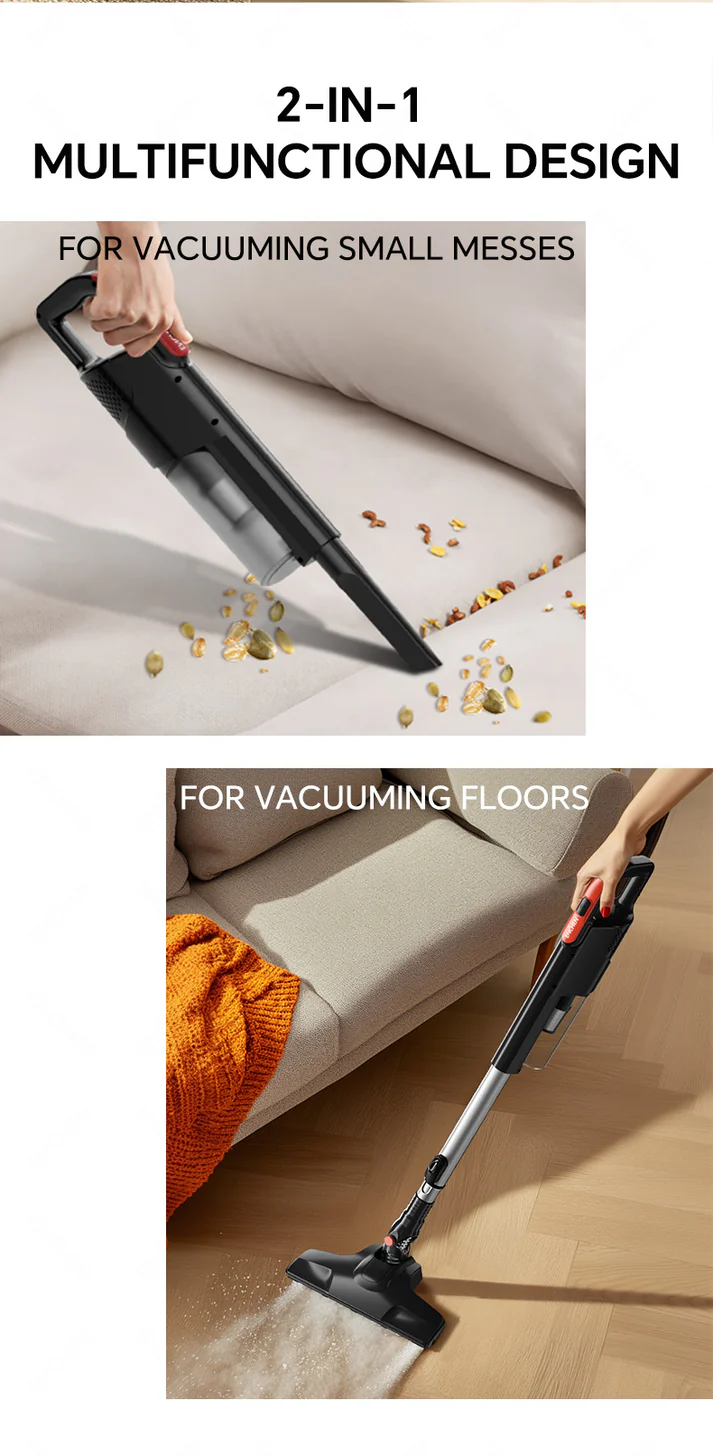 طراحی قابلتبدیل به حالت دستی و ایستاده (2-in-1) برای کاربرد گسترده در تمیزکاری کف، مبلمان و زاویههای سخت.