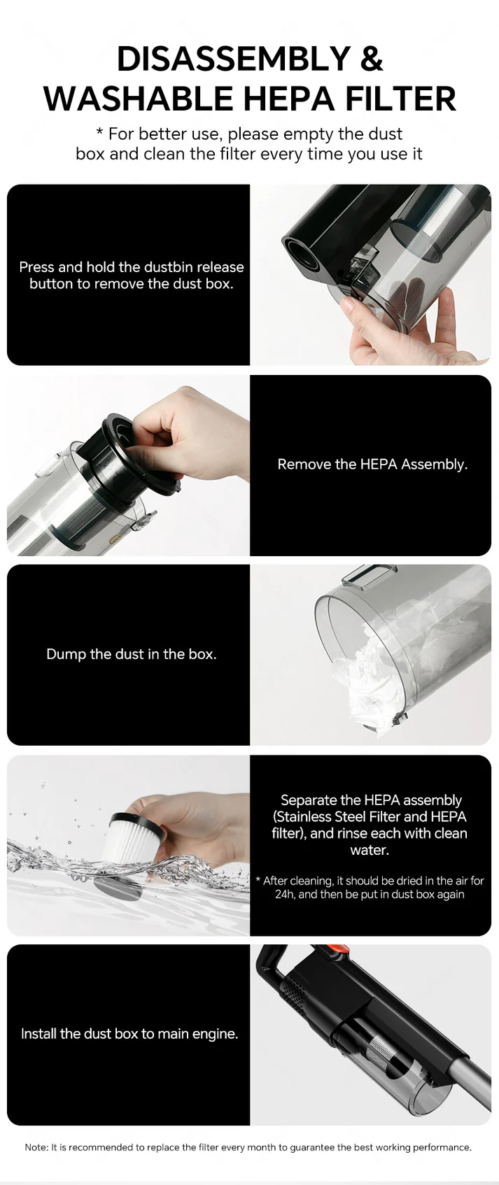 جمعآوری 1.2 لیتر زباله به شما اجازه میدهد بدون خالی کردن مکرر مخزن، ناحیهی بزرگی را تمیز کنید.