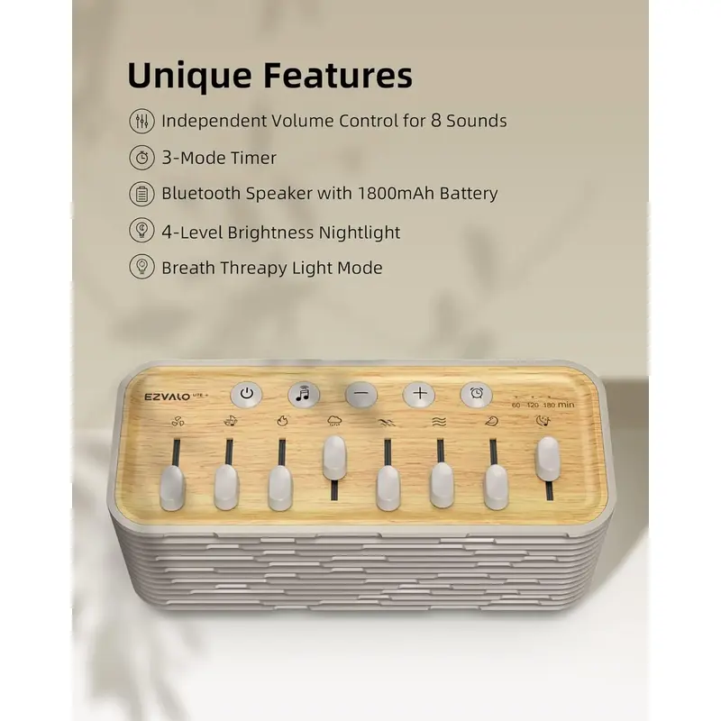 این محصول با بیش از ۲۵۵ گزینه ترکیب صدا (Mixer Options)، اسپیکر داخلی قدرتمند، نور شب، تایمر خواب، درمان تنفسی و جک هدفون ۳.۵ میلیمتری، امکان ایجاد محیط صوتی شخصیسازیشده را فراهم میکند.