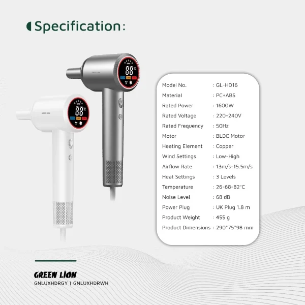 سشوار گرین لاین Green Lion Luxair Hair Dryer انتخابی هوشمندانه برای افرادی است که به خشککردن سریع، کنترل دقیق دما و طراحی سبک اهمیت میدهند. این سشوار با موتور BLDC قدرتمند 1600 واتی طراحی شده تا جریان باد یکنواخت و موثری ایجاد کند و در زمان کوتاهتری موها را خشک کند.