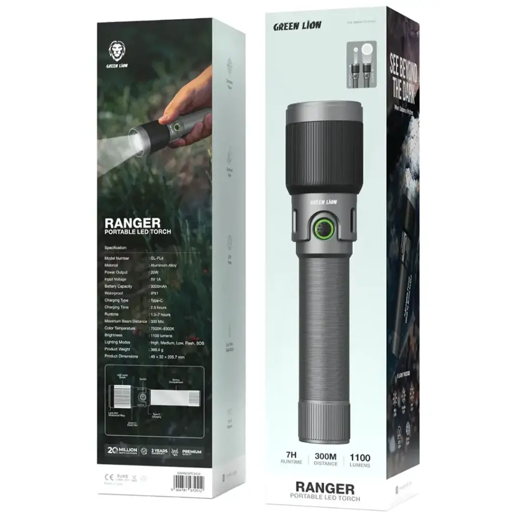 چراغ قوه شارژی گرین لاین Green Lion Ranger Portable LED Torch برای افرادی طراحی شده که به یک منبع نور قوی، سبک و قابلاعتماد نیاز دارند. شدت نور 1100 لومن در کنار برد 300 متری، این محصول را برای استفاده روزمره و فضای باز مناسب می کند.
