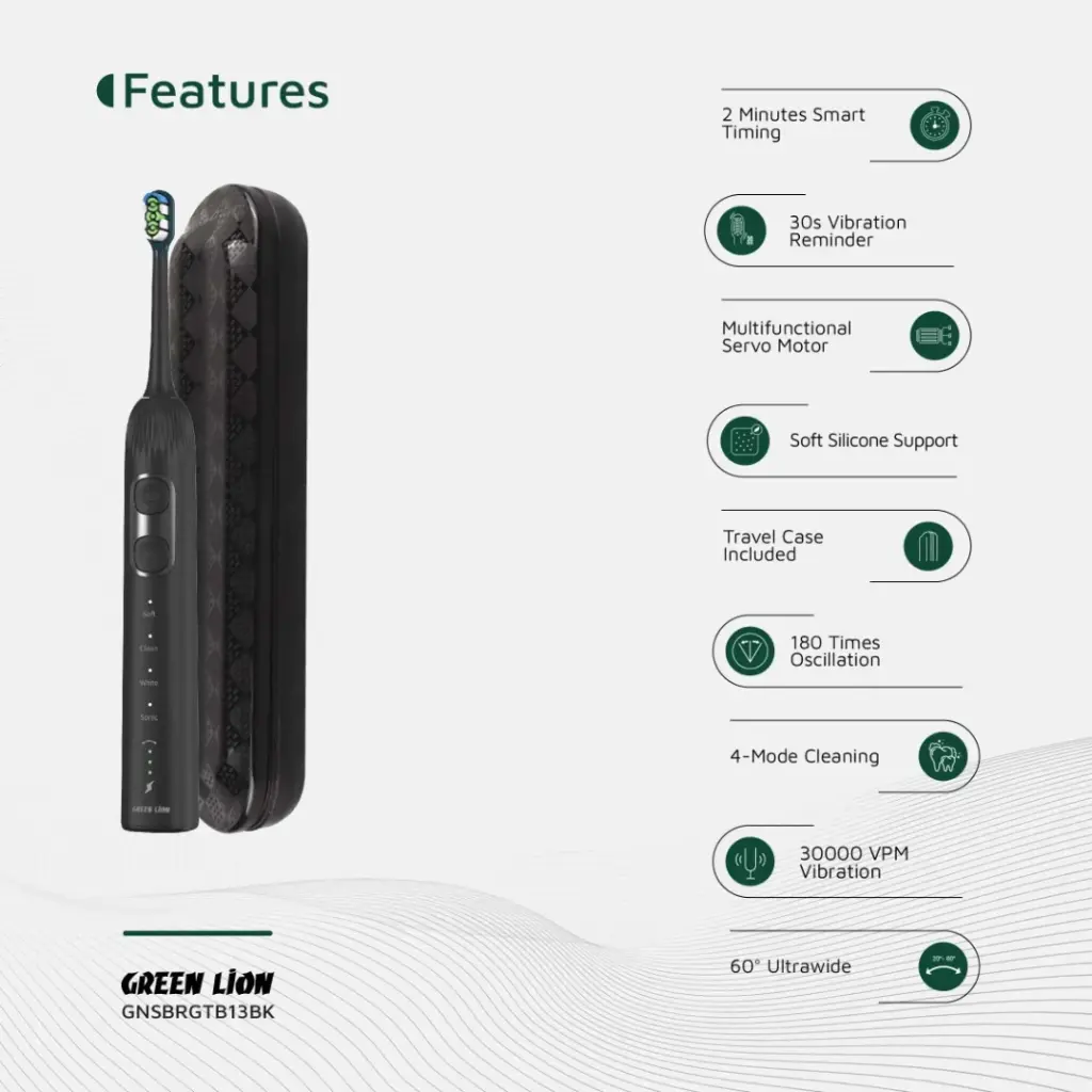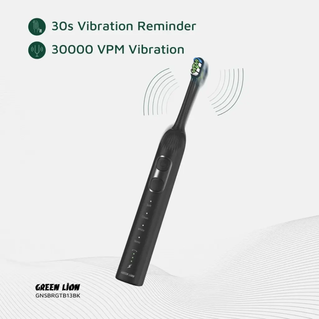 مسواک برقی گرین لاین Green Lion Smart Brush 60° Ultrawide با یادآور لرزشی ۳۰ ثانیهای و تایمر هوشمند ۲ دقیقهای، این مسواک به ایجاد عادت صحیح مسواک زدن کمک میکند و تمیزی کامل دهان را تضمین مینماید.