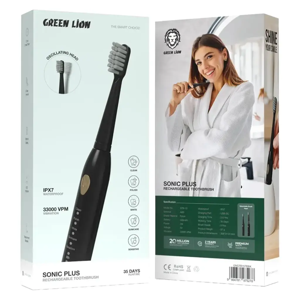 مسواک برقی قابل شارژ سونیک پلاس گرین لاین Green Lion Sonic Plus شامل دو سری اضافه است که طول عمر محصول را افزایش میدهد و همیشه تازه و مؤثر باقی میماند. این بستهبندی، تجربه ای حرفه ای و کامل از مراقبت دهان و دندان را برای کاربران فراهم می کند.