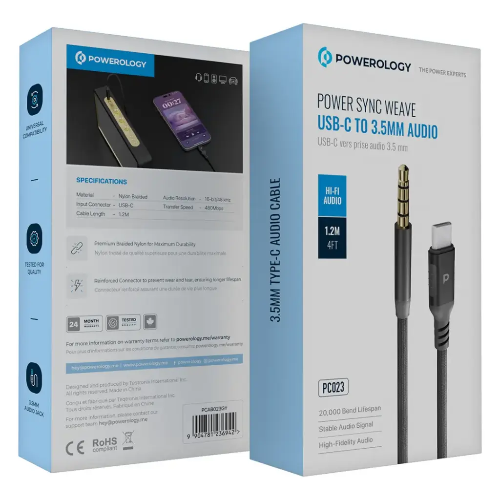 کابل TYPE-C به AUDIO پاورولوژی Powerology Power Sync Weave USB-C To 3.5mm Audio 1.2m Cable به جک ۳.۵ میلی‌متری صدا با طول ۱.۲ متر، با ساختار بافته‌شده از نایلون ساخته شده است که دوام و انعطاف‌پذیری بالایی فراهم می‌کند و تجربه صوتی خالص و بی‌نقصی را برای شما به ارمغان می‌آورد.