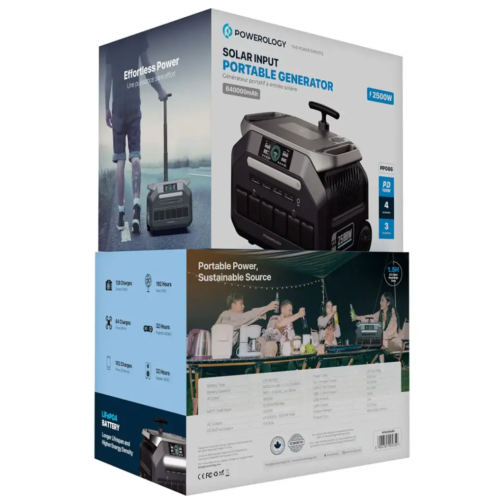 ژنراتور 640000 میلی آمپر پاورولوژی Powerology Solar Input Portable 640000mAh Generator با ورودی خورشیدی و ظرفیت باتری عظیم 640000 میلیآمپرساعت (3.2 ولت) و 2048 واتساعت، توان خروجی 2500 وات و حداکثر توان 5000 وات را ارائه میدهد که آن را برای انواع دستگاهها ایدهآل میکند.