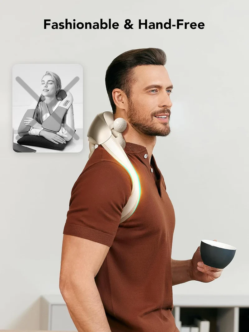 طراحی ارگونومیک و قابلحمل: با طراحی متناسب با انحنای گردن و شانه، این ماساژور بهراحتی در جای خود قرار میگیرد و برای انواع سایزهای گردن (12.5 تا 16.5 اینچ) مناسب است.